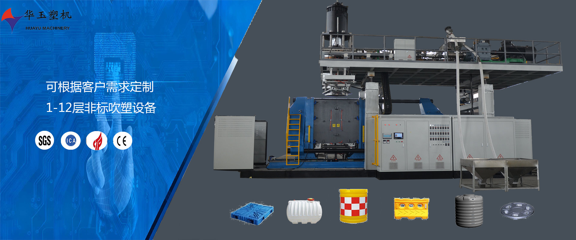 濰坊市華玉塑料機械有限公司創辦于貳零零貳年,是超大型全自動中空吹塑設備專業生產廠家。公司融合國內外先進技術和理念,專業設計、生產、銷售一層到十層的大型全自動中空成型機組。我公司生產的各型號吹塑機可生產50升到30,000升的各類塑料水桶,噸桶、雙環桶、水馬、路錐、隔離墻托盤、桌板、浮筒、皮劃艇、工具箱包等中空制品。優良的品質、穩定的性能、優越的性價比使公司產品不僅暢銷國內市場,并出口到亞洲、東南亞、中東、歐洲、北美、南美、非洲等80多個國家和地區,深受客戶的好評...